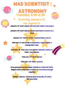 During the summer, we encourage school-aged children to continue reading by offering a NYS sponsored reading program. There are programs for beginning readers through elementary school students and a separate program for teens.