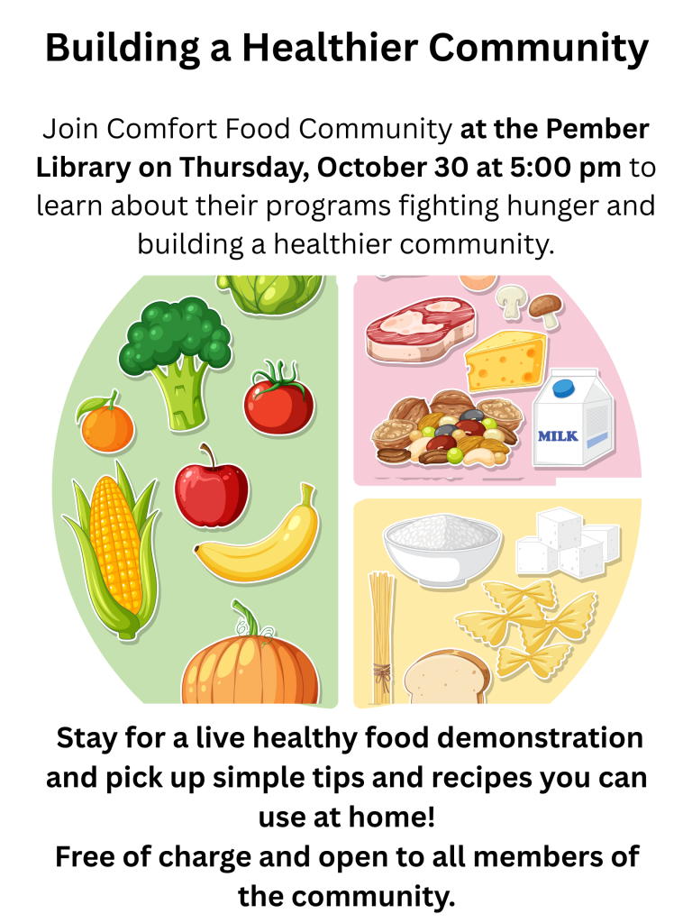 Comfort Food Community (CFC) will host an engaging program at the Pember Library on Thursday, October 30 beginning at 5:00 pm to introduce attendees to the organization’s mission and services that support local families.The presentation will highlight how CFC addresses food insecurity, strengthens the local food system, and connects neighbors to resources.