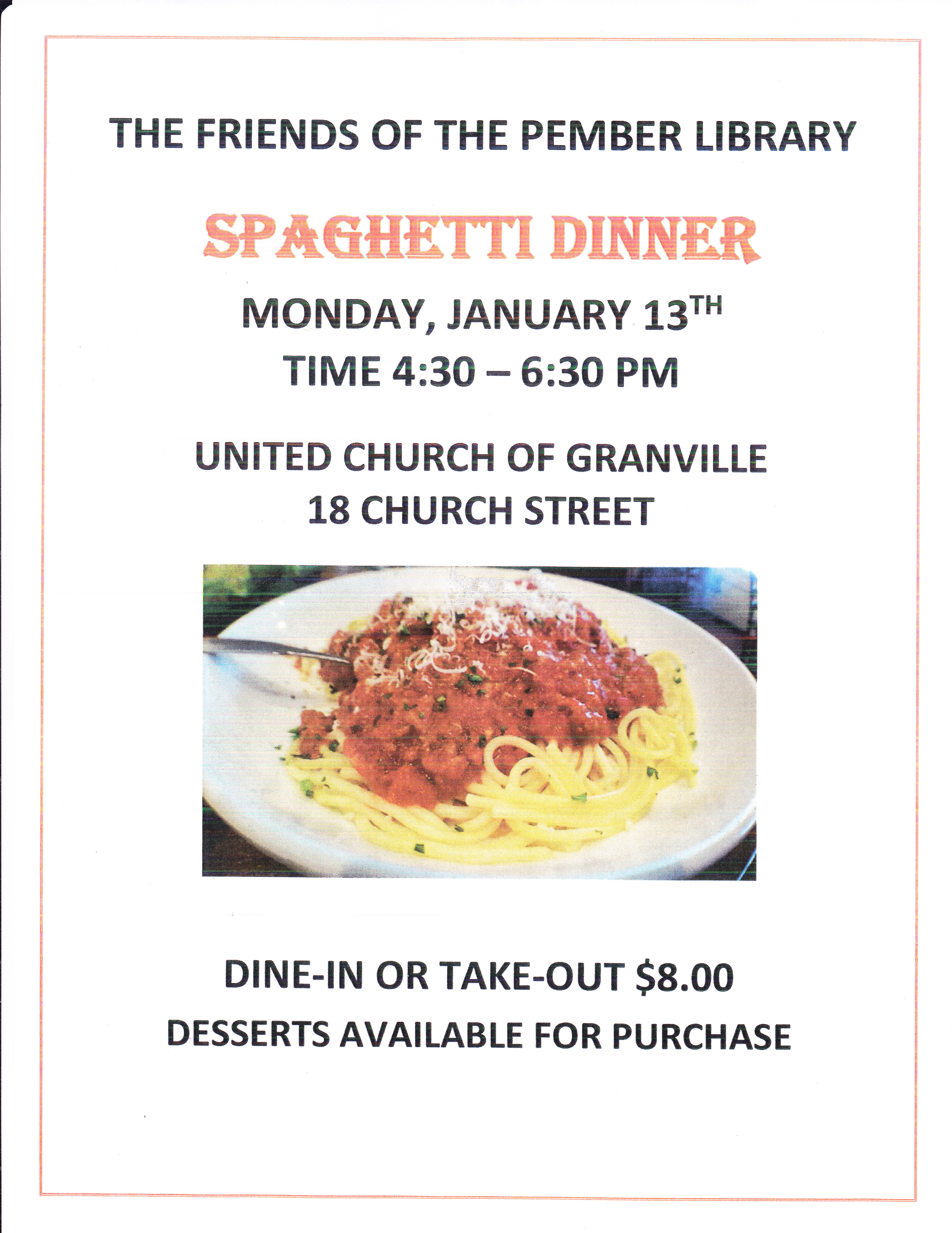 TO BENEFIT THE FRIENDS OF THE PEMBER LIBRARY Please join The Friends of the Pember Library on Monday, January 13, for a spaghetti dinner at the United Church of Granville located at 18 Church Street. The dinner is available beginning at 4:30 PM until 6:30 PM or until sold out. You can dine in or … Read more
