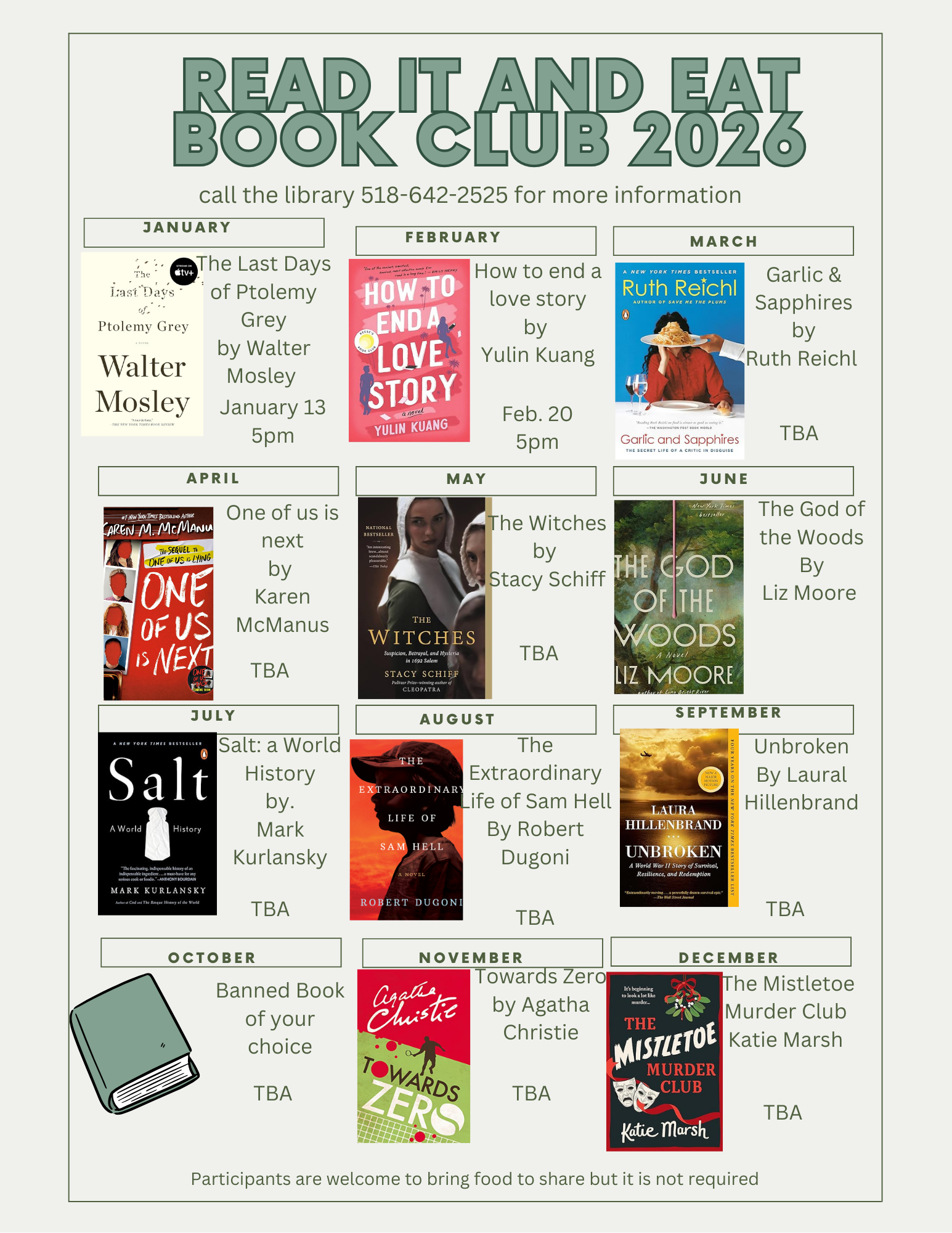 Join our monthly adult book club! Have a book discussion and enjoy some food. Participants are welcome to bring food to share but it is not required For more information call the library 518-642-2525 or email pember.library@gmail.com