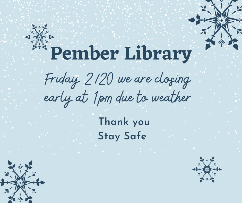 HomeThe LibraryThe Pember will closed early at 1pm today 2/20 The Pember will closed early at 1pm today 2/20 The Library KDesantisFebruary 20, 2026February 20, 20260
